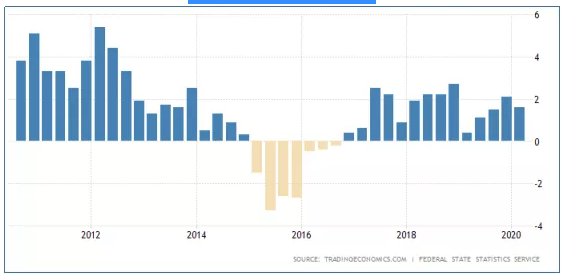 由于2014年3月份开始美国及欧美对俄罗斯的经济制裁,以及石油价格的下跌,2014年6月-12月一度下跌近50%。导致投资者对俄罗斯经济信心大跌,从而抛售俄罗斯资产,进一步引发卢布贬值,点燃俄罗斯金融危机的恐慌苗头。2015-2016年俄罗斯经济出现负增长,一度跌破负3%,之后一直维持在低位水平。