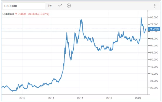 2014年由于石油价格的大幅下跌,及美国欧盟对俄罗斯实施制裁,导致投资者对俄经济丧失信心抛售资产。14年12月初到12月16日,俄股指下跌30%。从2014年7月至2015年2月,卢布急剧下跌。俄银行将利率从6.5%提升至17%也未能阻止卢布的下跌。14年3月17日,也就是克里米亚公投脱乌入俄后的第二天,同样是美国欧美发起制裁的日期,当天美元兑卢布为1美元兑换约36卢布,在目前(2020年7月25日)1美元兑换约72卢布,期间最高点为2016年1月22日1美元兑换约83卢布。而此数字为官方兑换比例,非官方兑换数字更高。