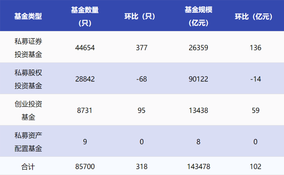 其中,截至5月底,存续备案私募证券投资基金44654只,较上月增加377只;规模2.64万亿元,较上月增加136.57亿元。5月底私募股权投资基金28842只,基金规模9.01万亿元,较上月减少14.84亿元,微降0.02%;