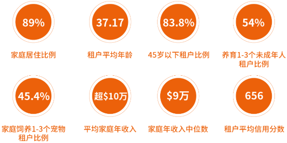 长租别墅的租户家庭年收入高,平均家庭年收入超过10万美元,家庭年收入中位数近9万美元,是美国中产阶级的典型代表