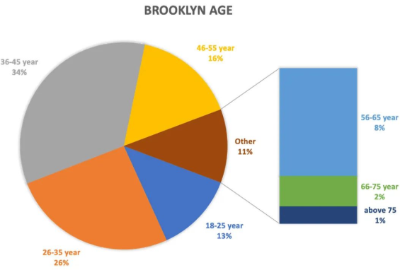 布鲁克林项目入住成年人口占66.9%,未成年人口占33%,平均成年人口年龄39.64岁,未成年人口9.68岁