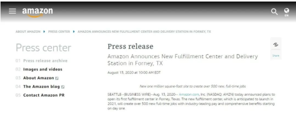 布鲁克林项目位于达拉斯东部新兴城镇Forney 福尼,通过80号高速公路30分钟直达达拉斯市中心。由于便利的交通和战略位置,吸引了诸多大型企业入驻。2020年初亚马逊宣布在福尼建设食品配送中心,占地20万平尺已开工,计划2020年末竣工投入使用。此外8月13日亚马逊正式宣布在福尼建设超100万平尺新的运营中心,计划投资8000万美元,估计2021年竣工投入使用,将产生超过500人全职就业。